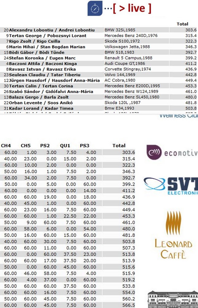 Clasamente în timp real, cu diferențele de timp între fiecare concurent